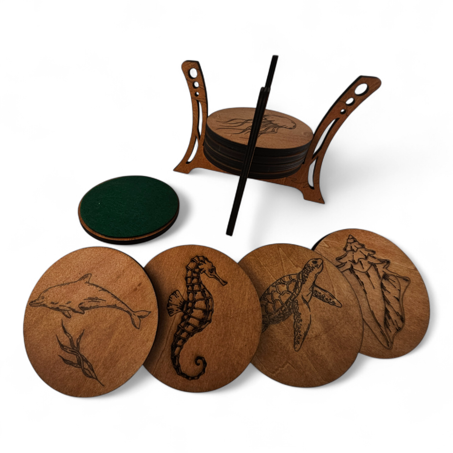 This hand-crafted wooden beverage coaster set of eight combines functionality with artistic craftsmanship. Each coaster features an elegant felt backing, designed specifically to protect your tabletop from scratches and moisture rings. The surface showcases meticulously laser-engraved themed and artistic designs, bringing unique visual appeal to your drinkware accessories. Finished with all-natural oils and coated with a protective acrylic layer, these coasters provide excellent resistance against moisture and spills, ensuring long-lasting durability and protection for your furniture. Since each piece is carefully handmade, every coaster boasts its own distinctive character and subtle variations, reflecting the artisan’s skill. The set includes eight coasters complemented by a handmade wooden stand, offering a stylish and practical solution for storing unused coasters while keeping your space organized. Ideal for enhancing any living room, office, or bar area, this set effortlessly blends elegance and protection.
