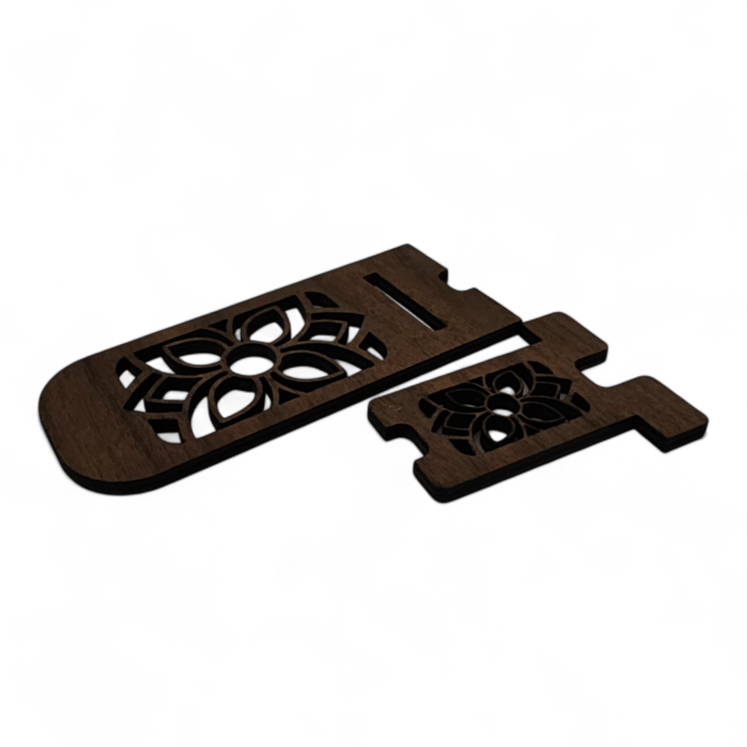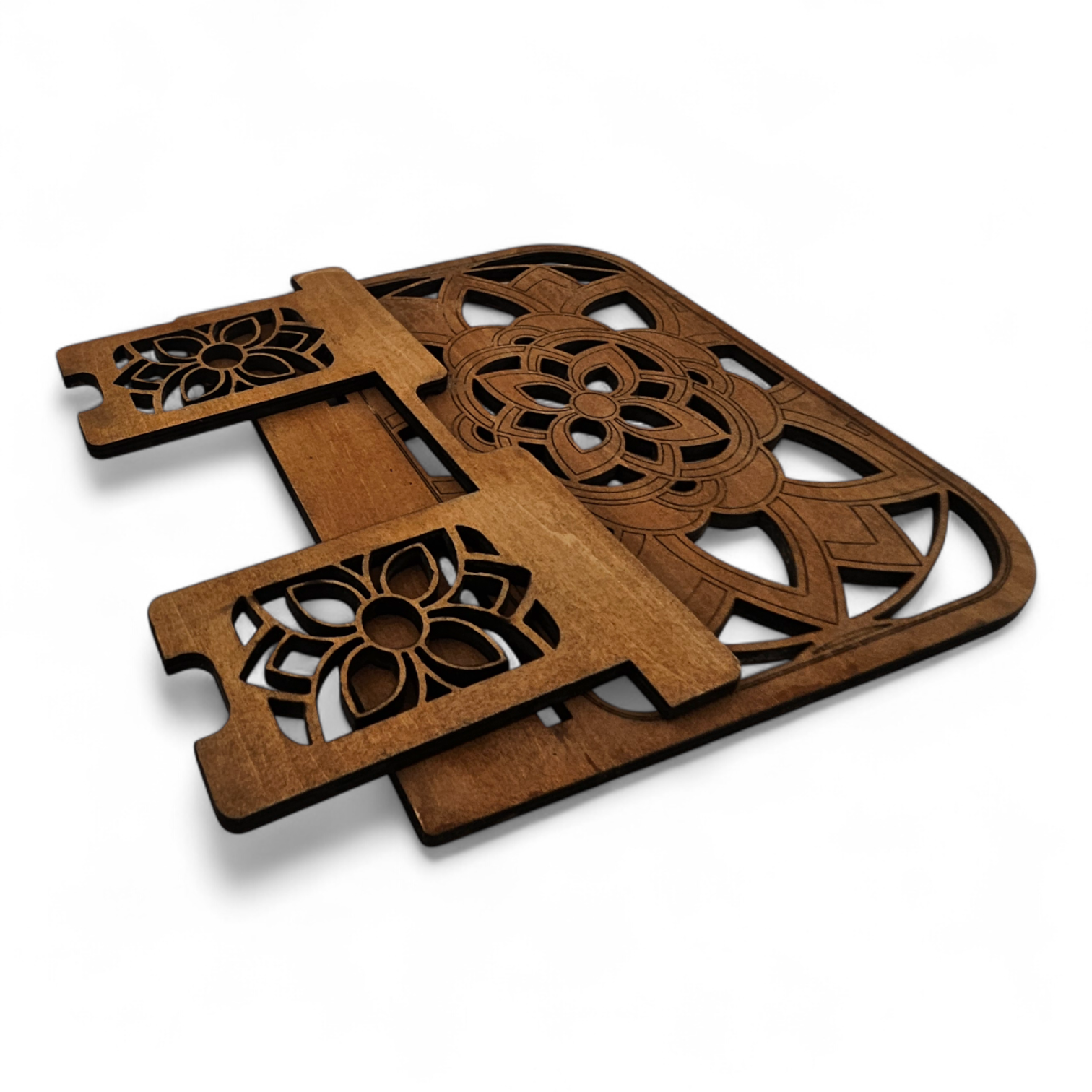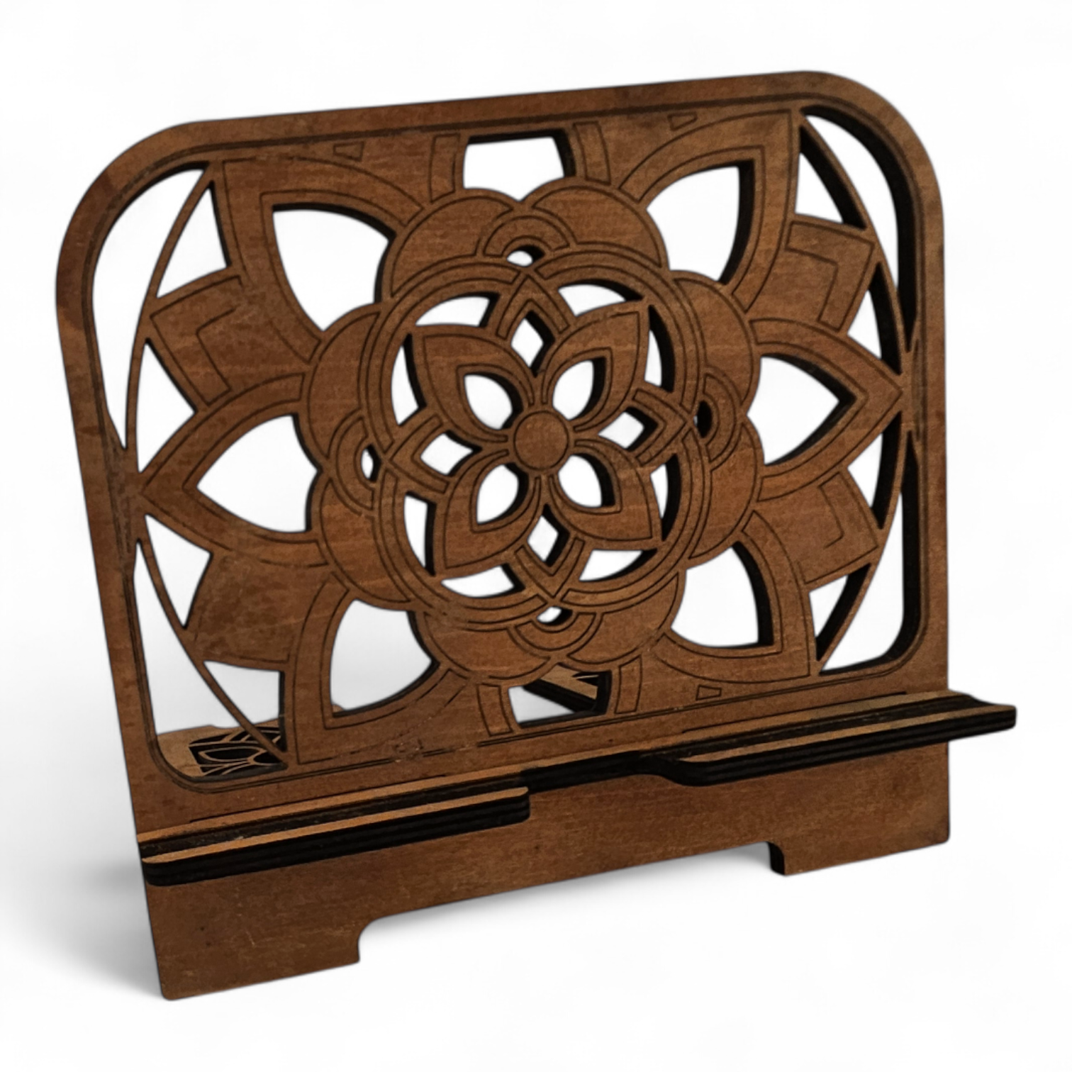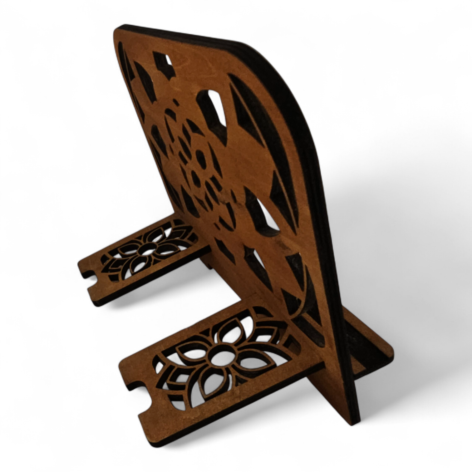 This meticulously hand-crafted wooden iPad and picture stand combines artistry with function. Featuring unique laser-etched designs and precise cutwork, the stand showcases an intricate geometric circle pattern that adds a visually captivating element to any setting. Its foldable design allows for effortless portability, making it an ideal companion for travel or flexible use around the home or office. Crafted from high-quality wood and treated with natural tung and citric oils, it is then protected with a gloss coat of beeswax, providing a durable and elegant finish that resists wear and enhances the wood’s natural beauty. This accessory not only serves as a reliable support for your devices or displays but also elevates your décor with its distinctive craftsmanship and sophisticated aesthetic. Whether placed on a desk, shelf, or bedside table, it offers a blend of convenience, durability, and refined style that suits both professional and personal environments.