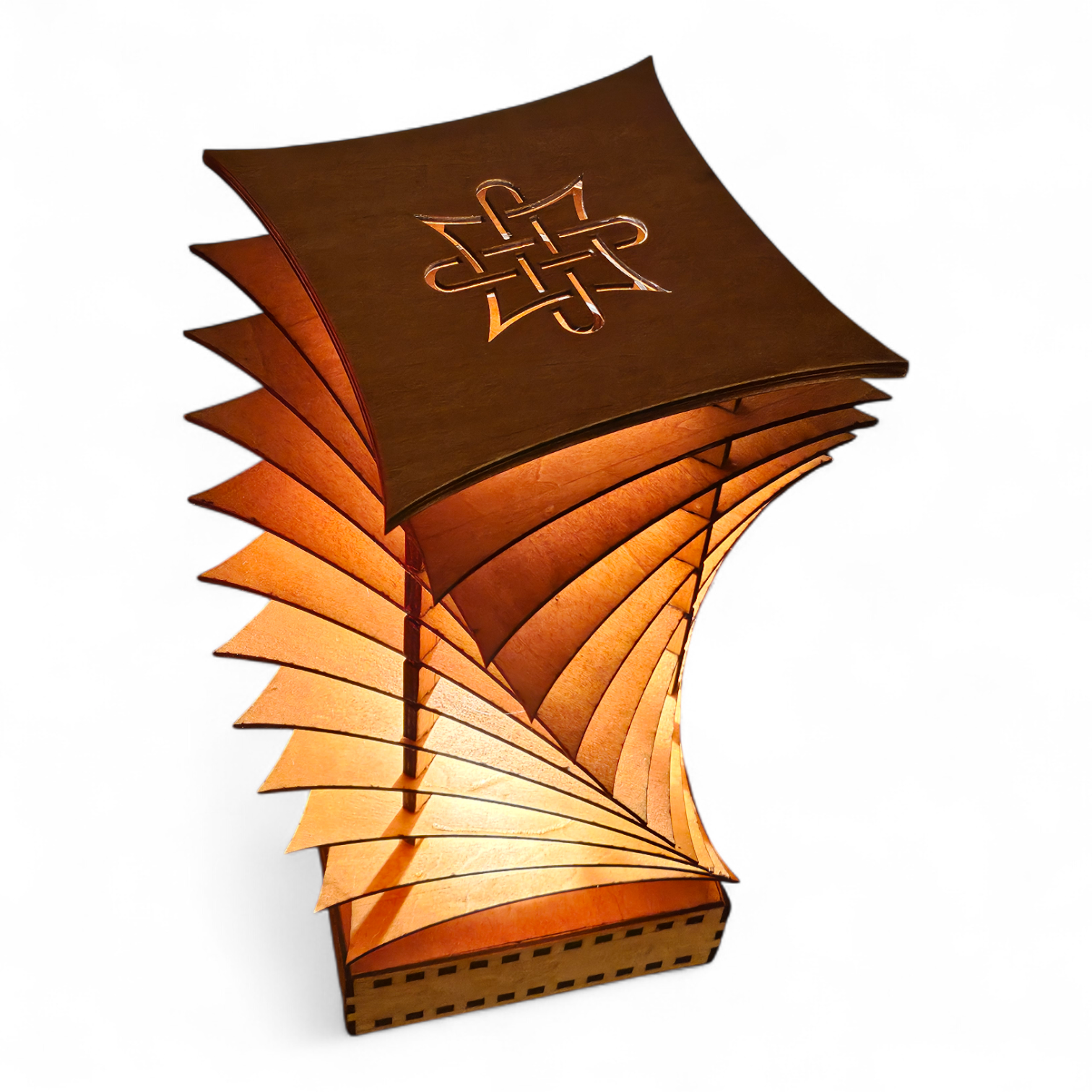 This intricately laser-cut louvered table lamp showcases a dynamic design of twisting geometric shapes that spiral gracefully upward, adding both artistic appeal and visual interest to any room. It accommodates an E12 long bulb, providing a soft, warm glow that creates an inviting and soothing atmosphere. Each lamp is meticulously handcrafted, treated with all-natural oils and sealed with a refined beeswax polish to enhance its natural beauty and durability. Ideal for bedroom nightstands or living room accents, this lamp combines artisanal craftsmanship with functional lighting to elevate your interior space with subtle elegance and warmth.